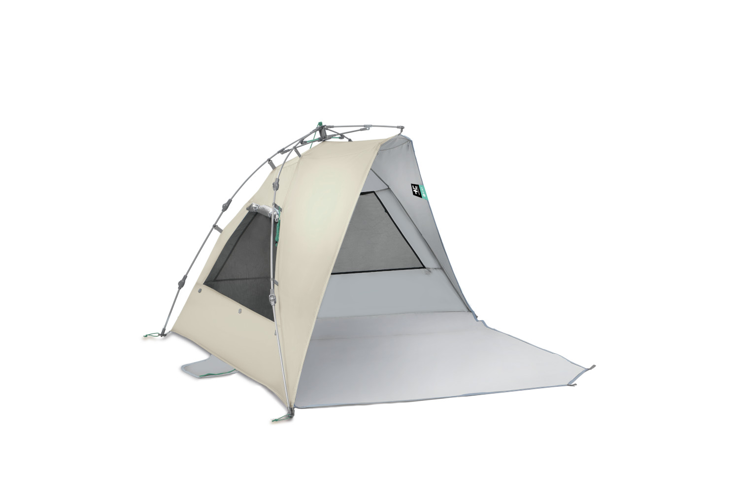 Große Fenster für beste Belüftung und Rundumsicht, die mit einem Handgriff verschlossen werden können. Mit Innentaschen für die Ablage persönlicher Gegenstände. Die weit nach vorne gezogene Bodenplane kann hochgezogen und an den dafür vorgesehenen Haken innen befestigt werden. Sie dient auf diese Weise als Sichtschutz. Im Übrigen gelten die Merkmale der Modelle Reka Kohu Plus rPET und Kau Kohu Plus rPET: Sehr hoher UV-Schutzfaktor (UPF 50+) und hohe Windstabilität (bis 7 BF). Dank der Aufbauautomatik öffnet und schließt die Muschel in Sekundenschnelle auf sehr einfache Art und Weise. Bei starkem Wind füllt man die drei seitlichen Taschen mit Sand oder Kieselsteinen und sorgt somit für weitere Stabilität. Liegefläche für 2 Personen.